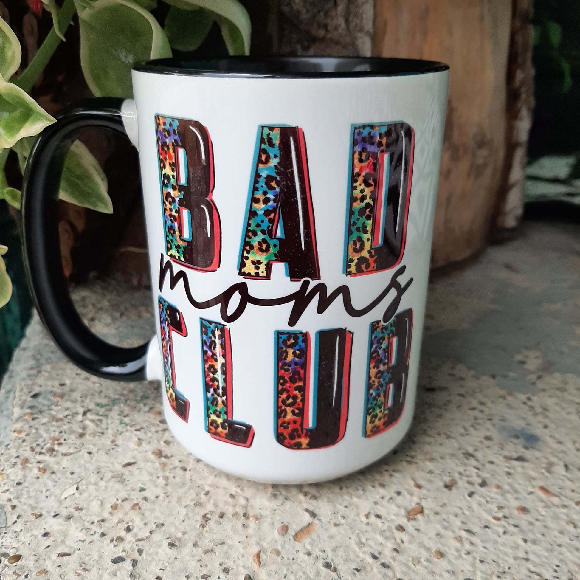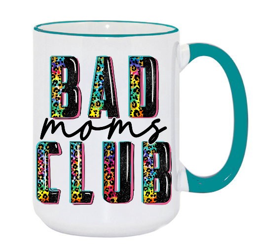 Our Bad moms Club design is available on 8 mugs: White, White w/teal, White w/black, White w/pink, White w/blue, White w/green, White w/yellow, and White w/red.