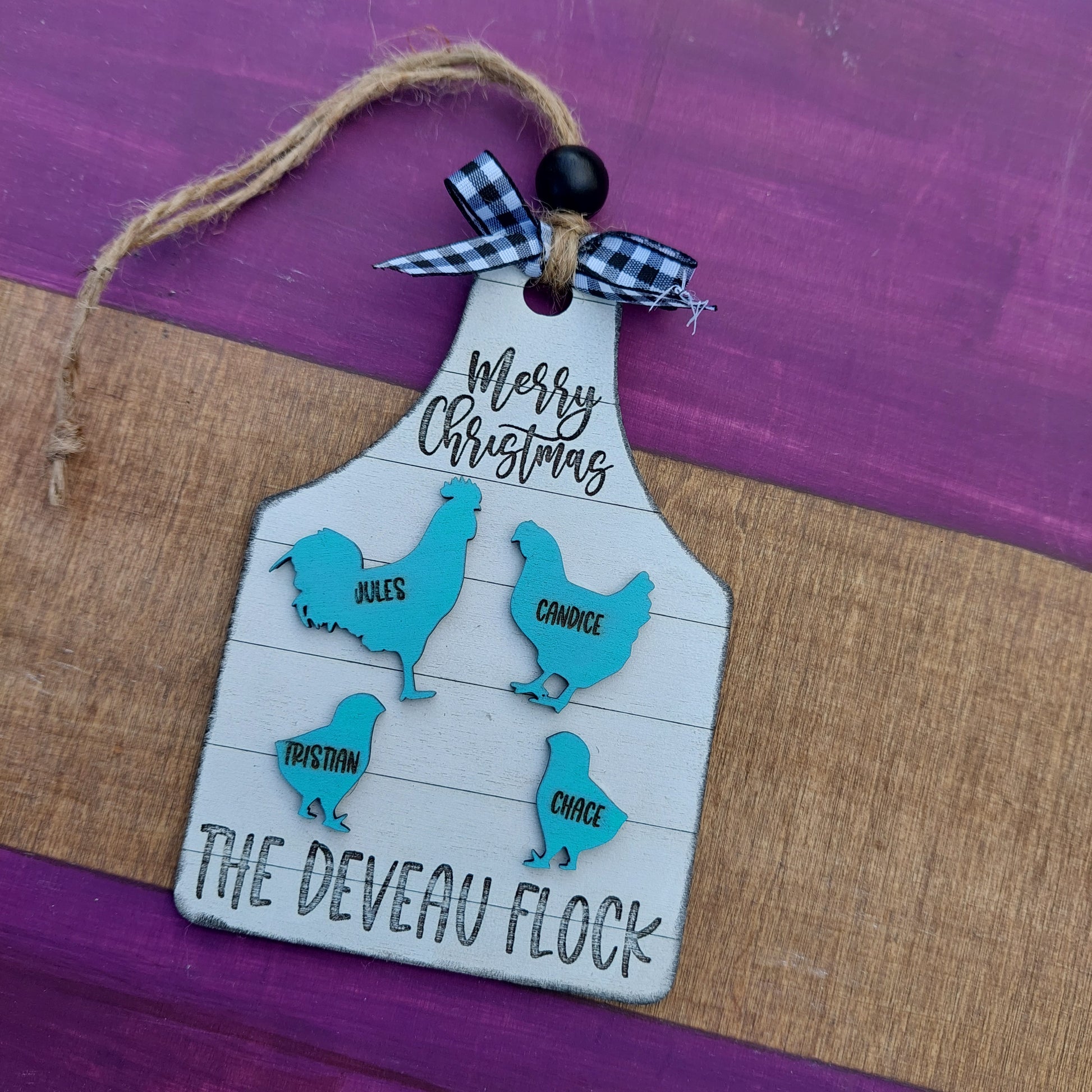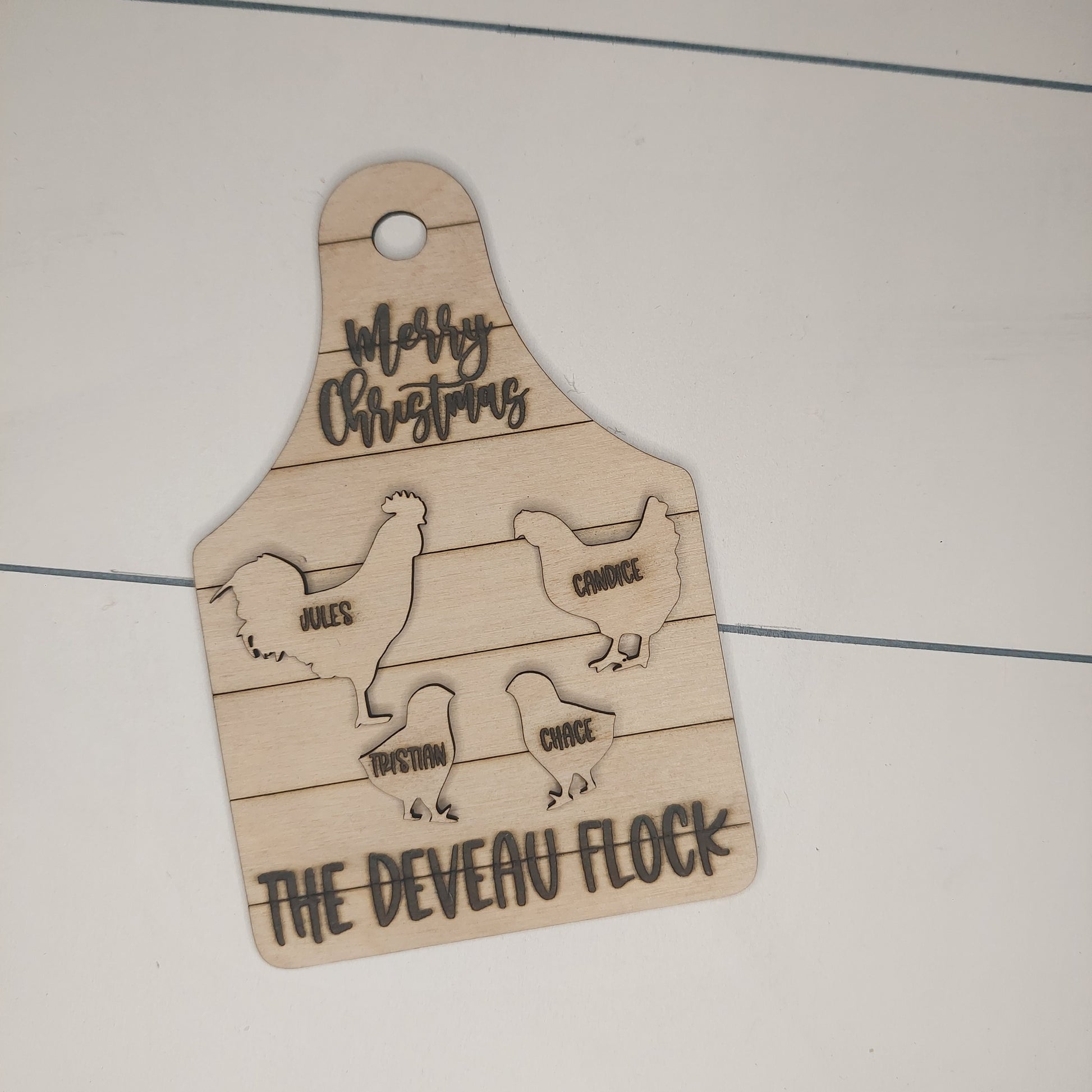 Personalized Chicken Flock Family Ornament. The chickens sit on top of a shiplap tag. The names are engraved onto each of the chickens. You can choose what you would like the bottom of the ornament to say ~ Our Flock, The 'Your Last Name' Flock, Christmas 2024, Merry Christmas will be placed at the top like shown in the pictures unless otherwise requested.