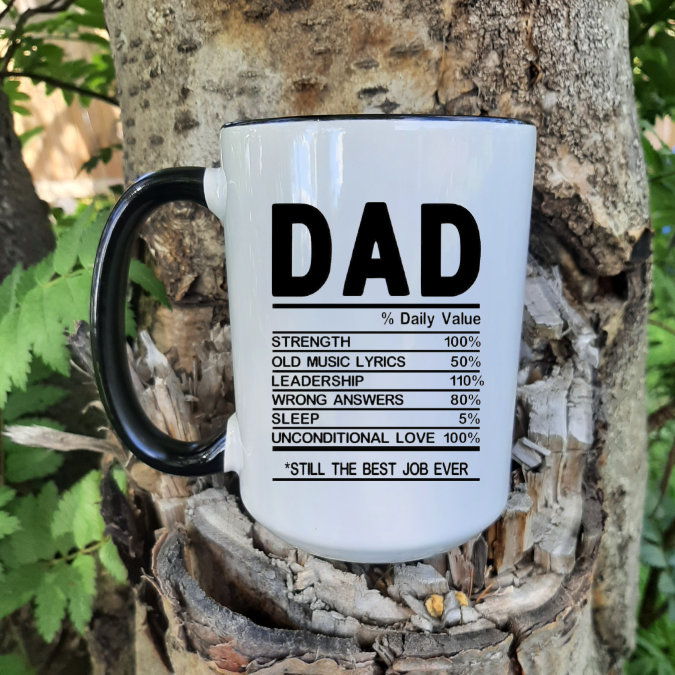 Our DAD Ingredients design is available on 7 mugs: White, White w/teal, White w/yellow, White w/blue, White w/ green, White w/red, or White w/black.