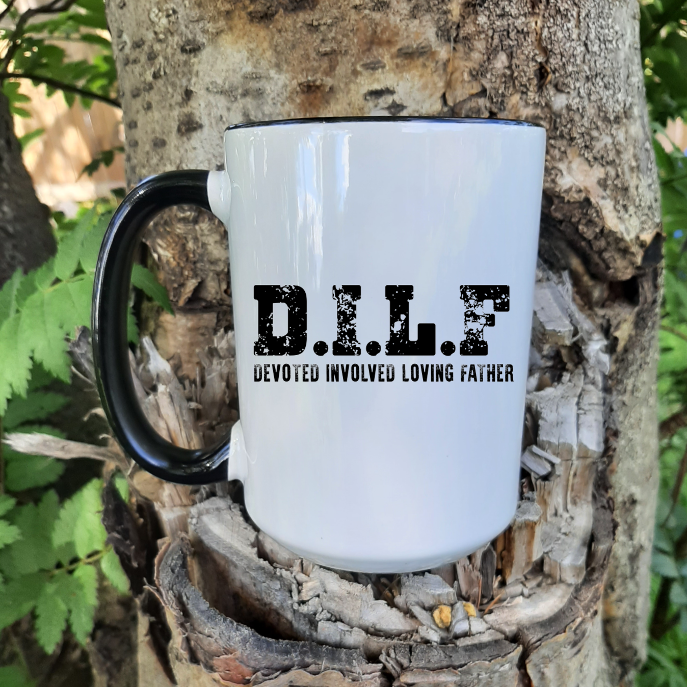 Our DILF design is available on 7 mugs: White, White w/teal, White w/yellow, White w/blue, White w/ green, White w/red, or White w/black.