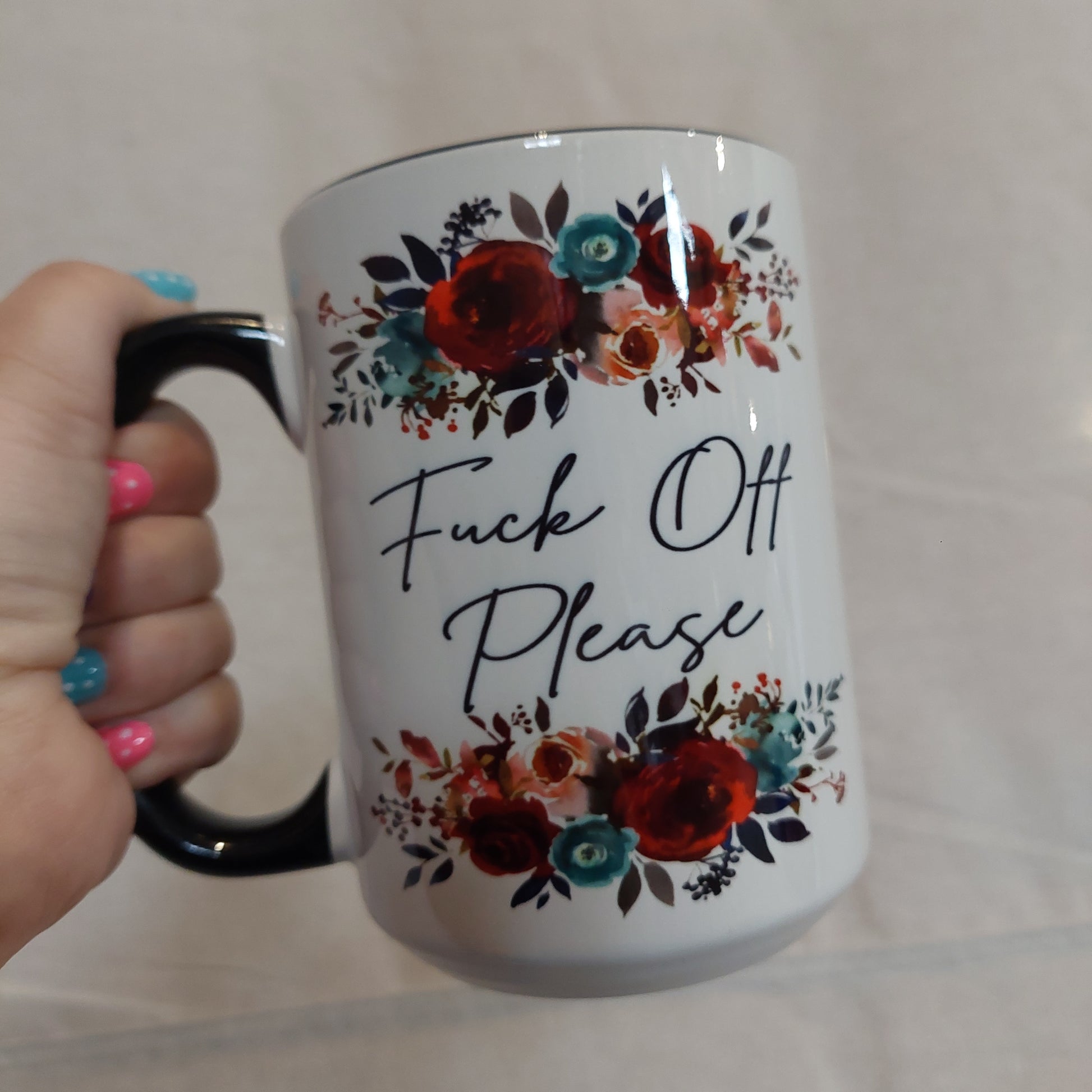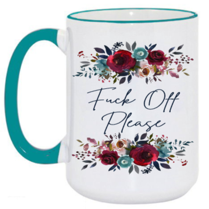 Our Fuck Off Please design is available on 3 mugs: White, White w/teal, and White w/black.