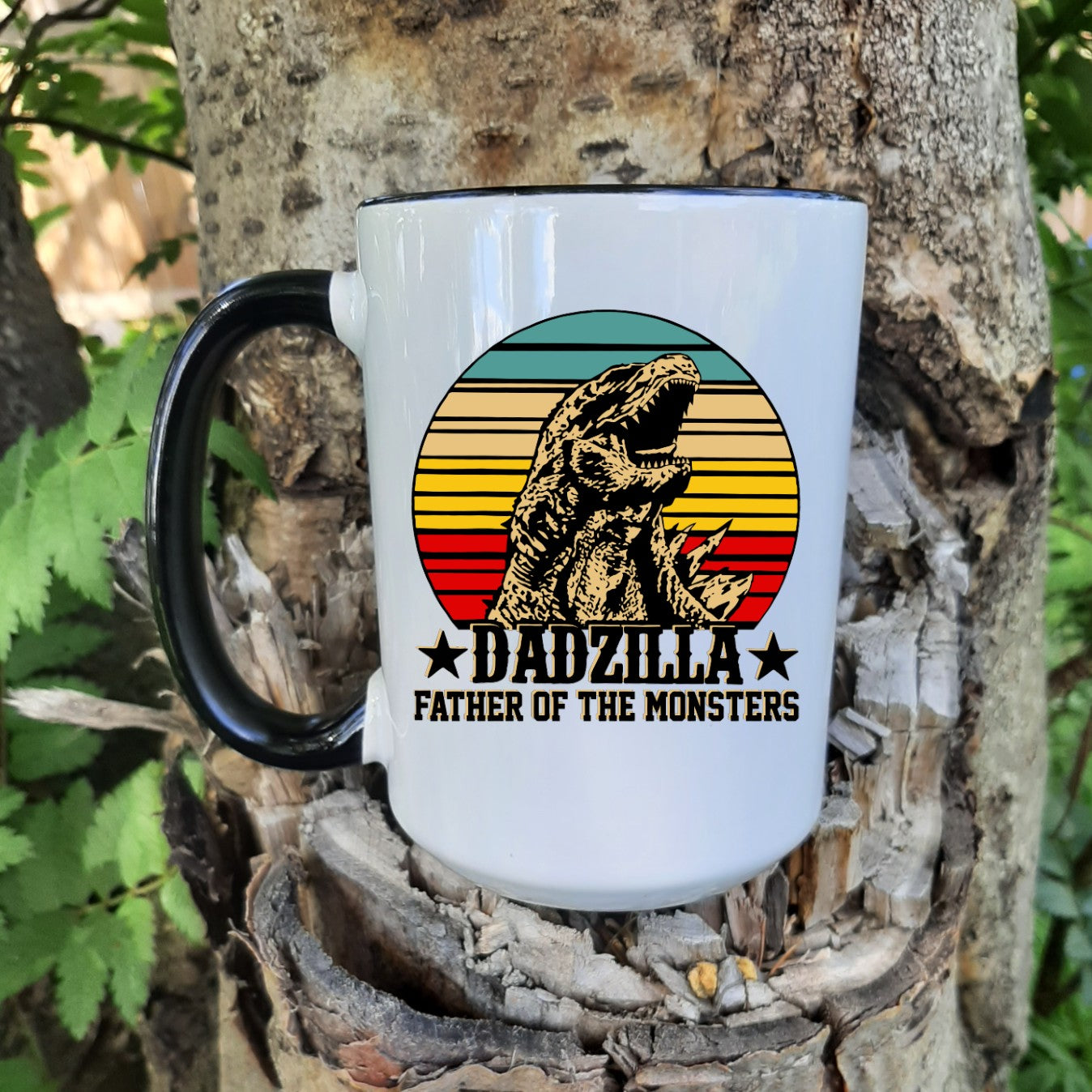 Our Dadzilla design is available on 7 mugs: White, White w/teal, White w/yellow, White w/blue, White w/ green, White w/red, or White w/black.