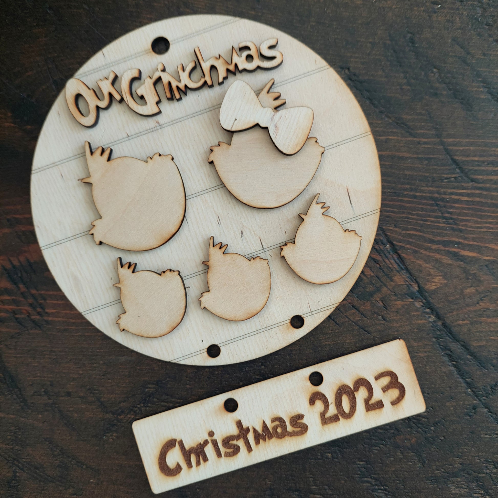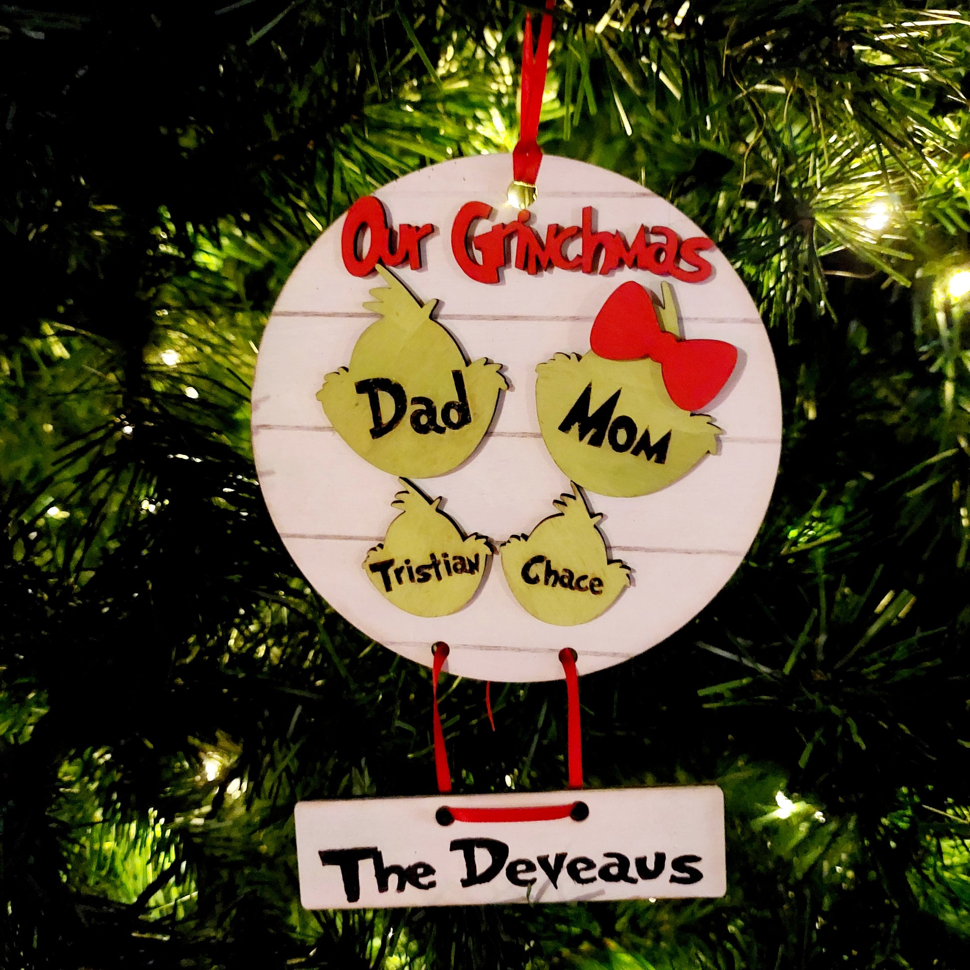 Personalized Grinch Family Ornament. You can choose what you would like the bottom of the ornament to say ~ Christmas 2024, Merry Christmas, The "Your name" Family, The "your name", or you can get creative. Top of the ornament features Our Grinchmas. Names are engraved on to each Grinch head.