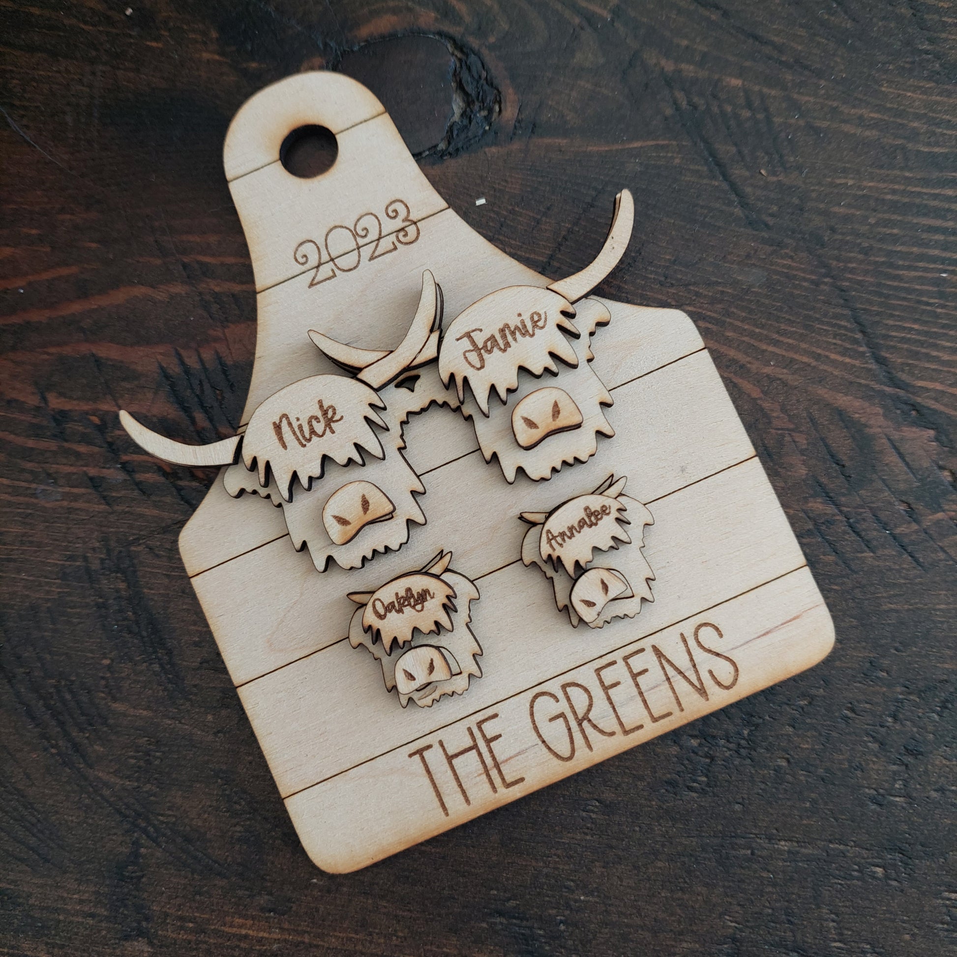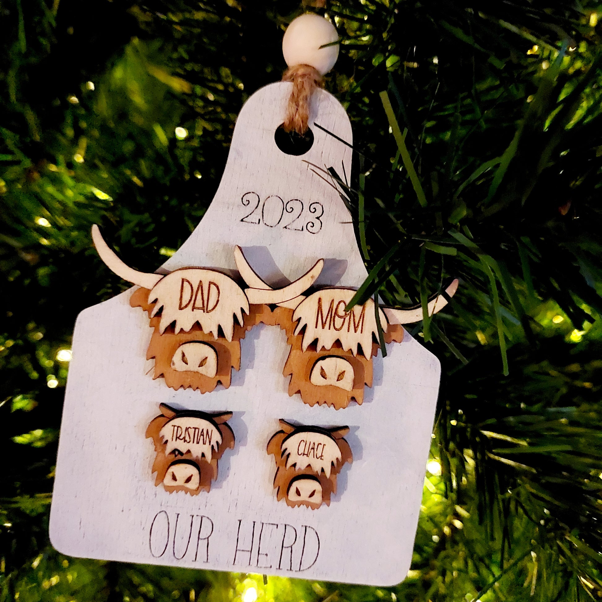Personalized Highland Cows Family Ornament. The highland cows sit on top of a shiplap Cattle Tag. The names are engraved onto each of the Highland Cows. You can choose what you would like the bottom of the ornament to say ~ Our Herd, The 'Your Last Name' Herd, Christmas 2024, Merry Christmas or you can get creative. 2024 will be placed at the top like shown in the pictures unless otherwise requested.
