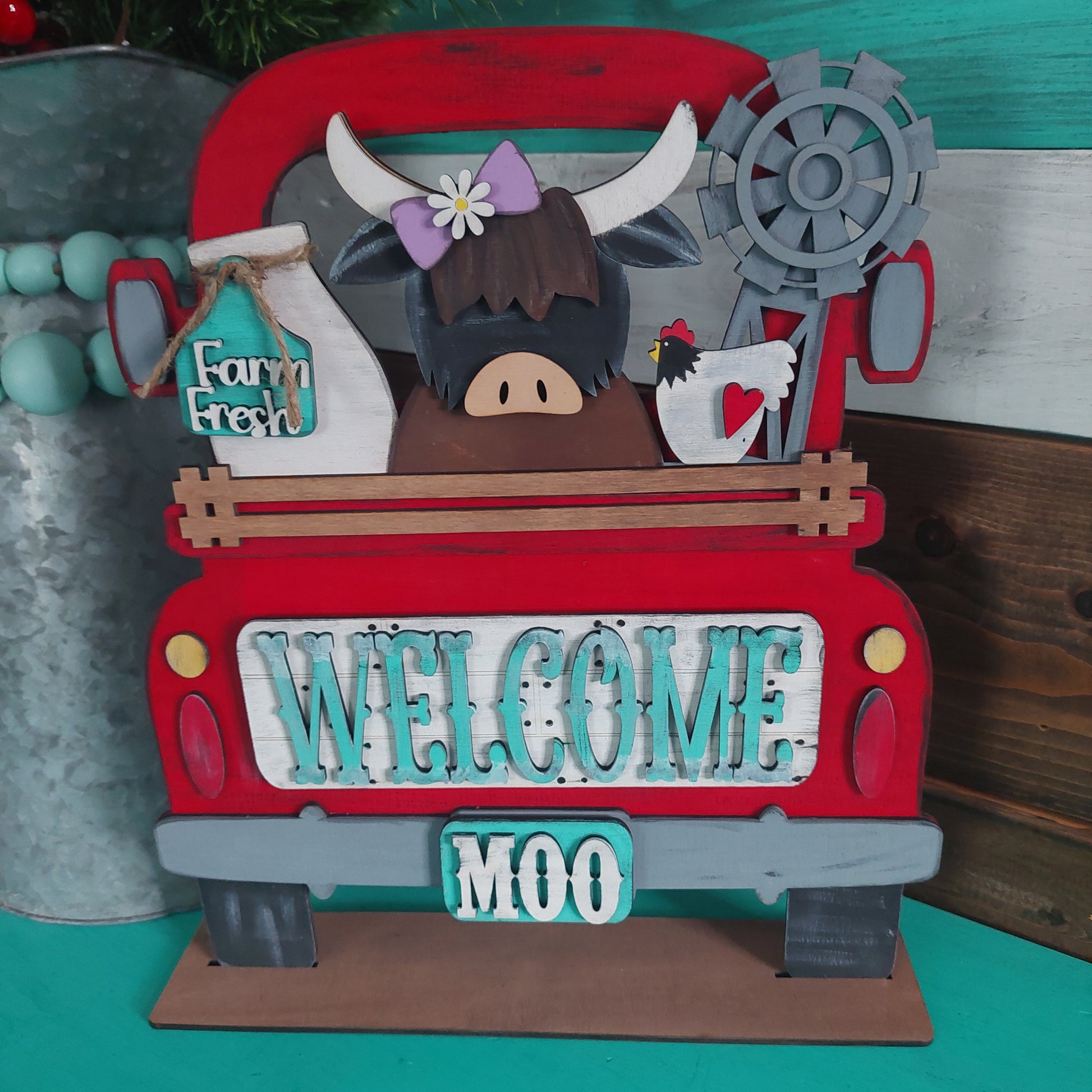 This Highland Cow Truck Insert is a fun diy wood craft to put together. It is great for parties, gifts, or just something for yourself. Available in a DIY Kit, Paint By Numbers Kit, or Blank Kits. Truck/display stand not included. Truck can be found here. Pallet Board can be found here. Farmhouse Cutting Board can be found here. Garden Fence can be found here.