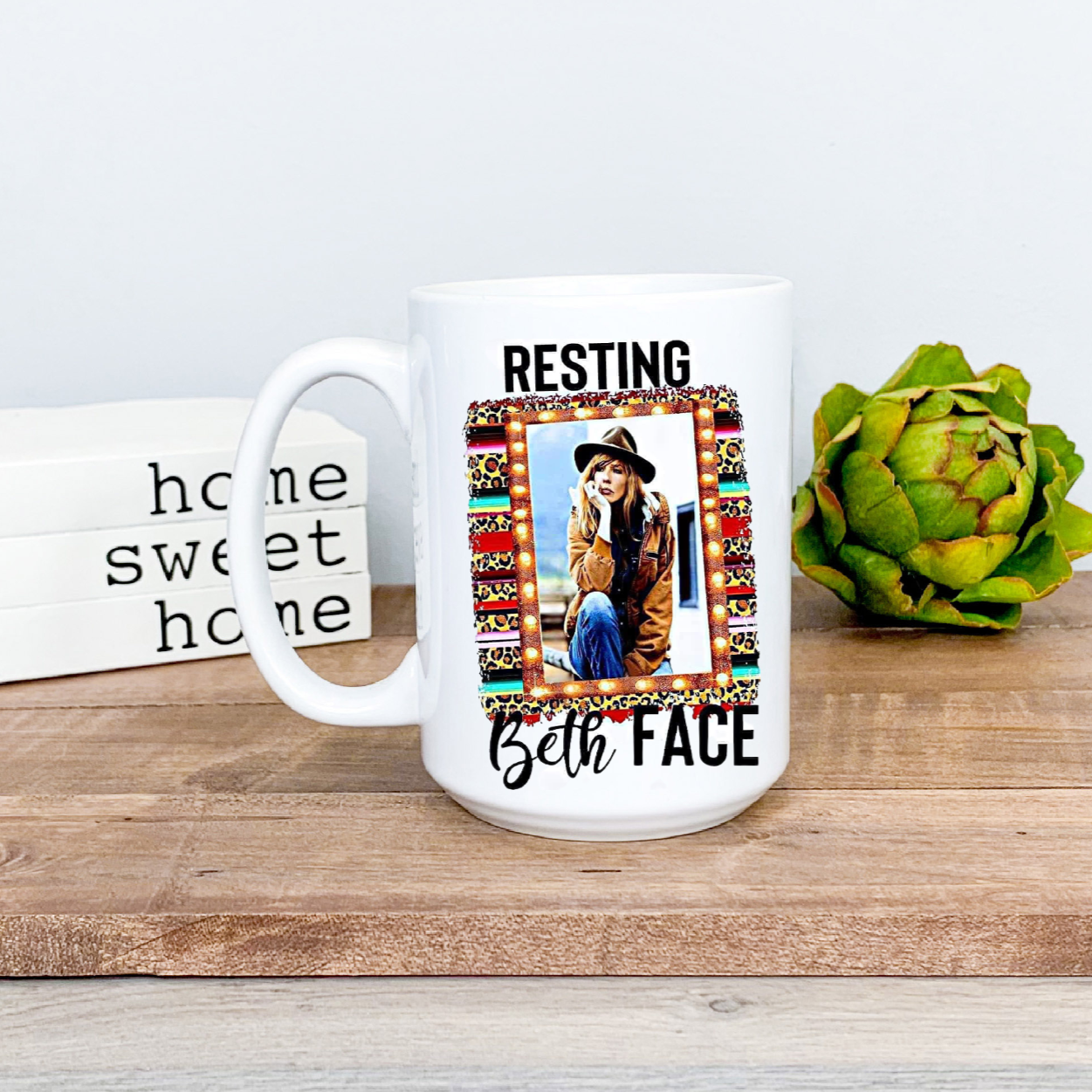 Our Resting Beth face design is available on 2 mugs: White or White w/black.