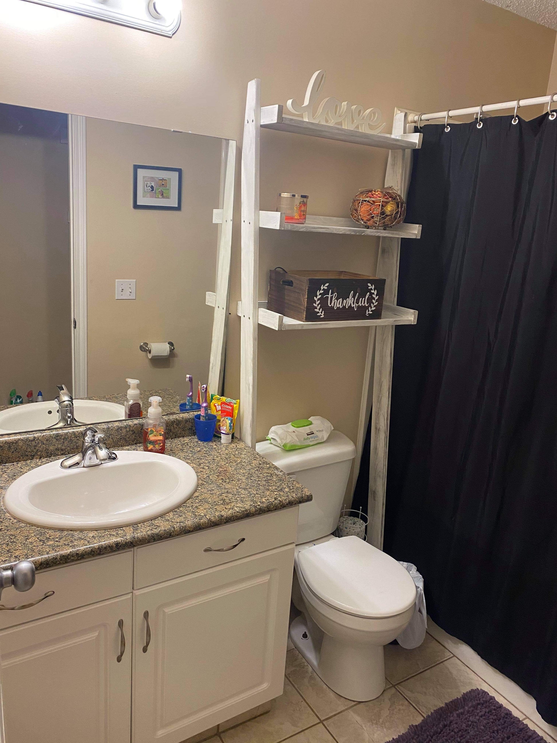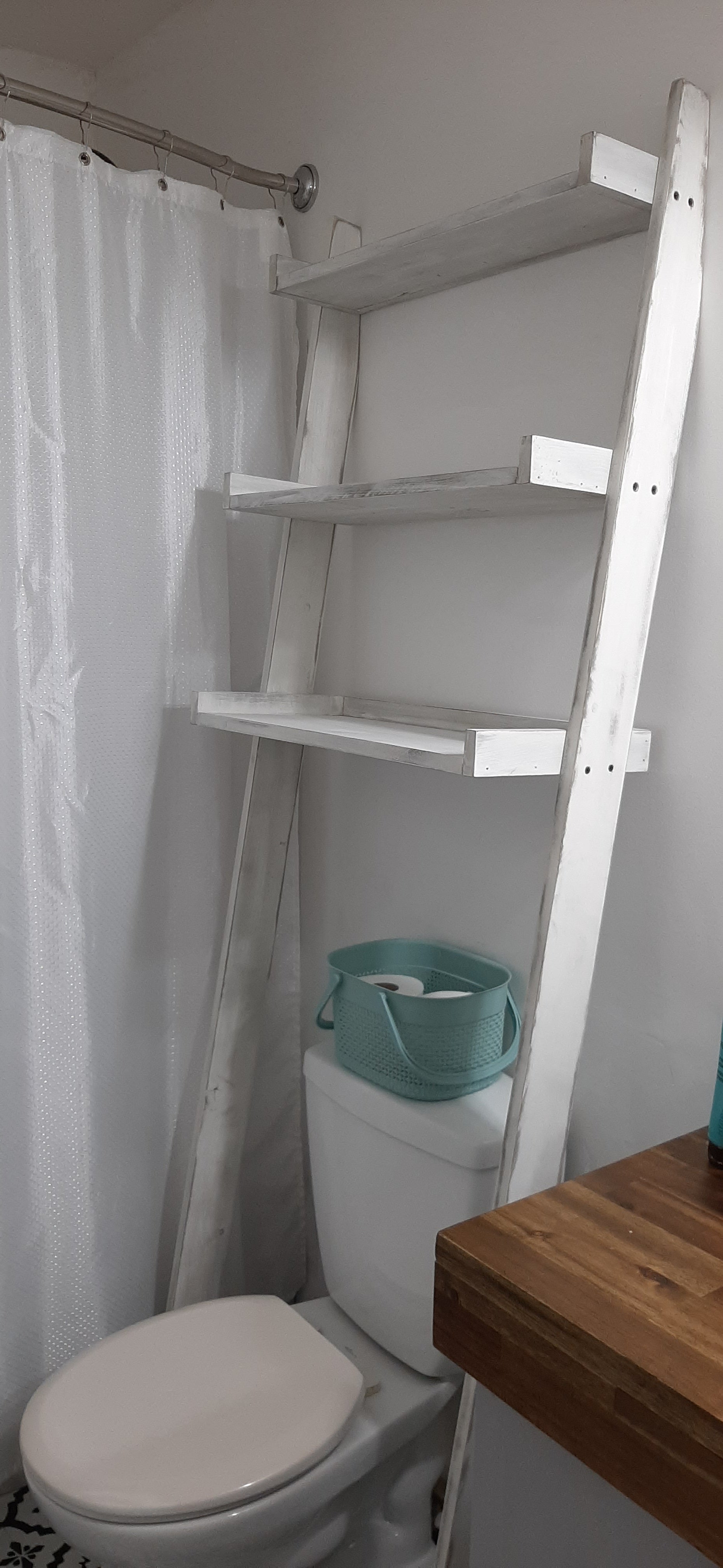 Our over the toilet shelf ladders are custom made to order. Each ladder has 3 shelves.