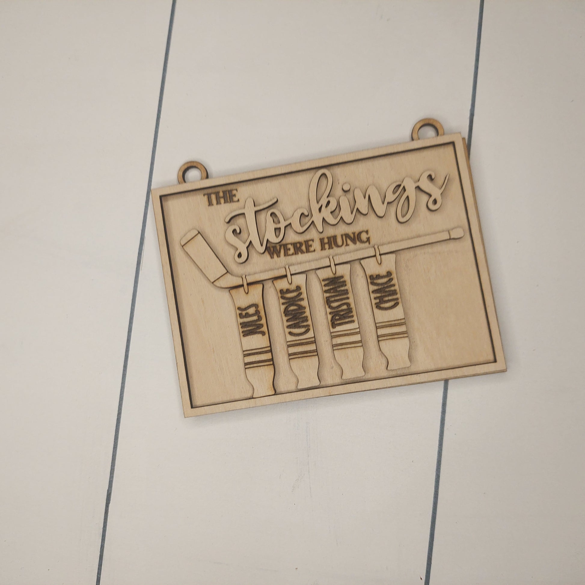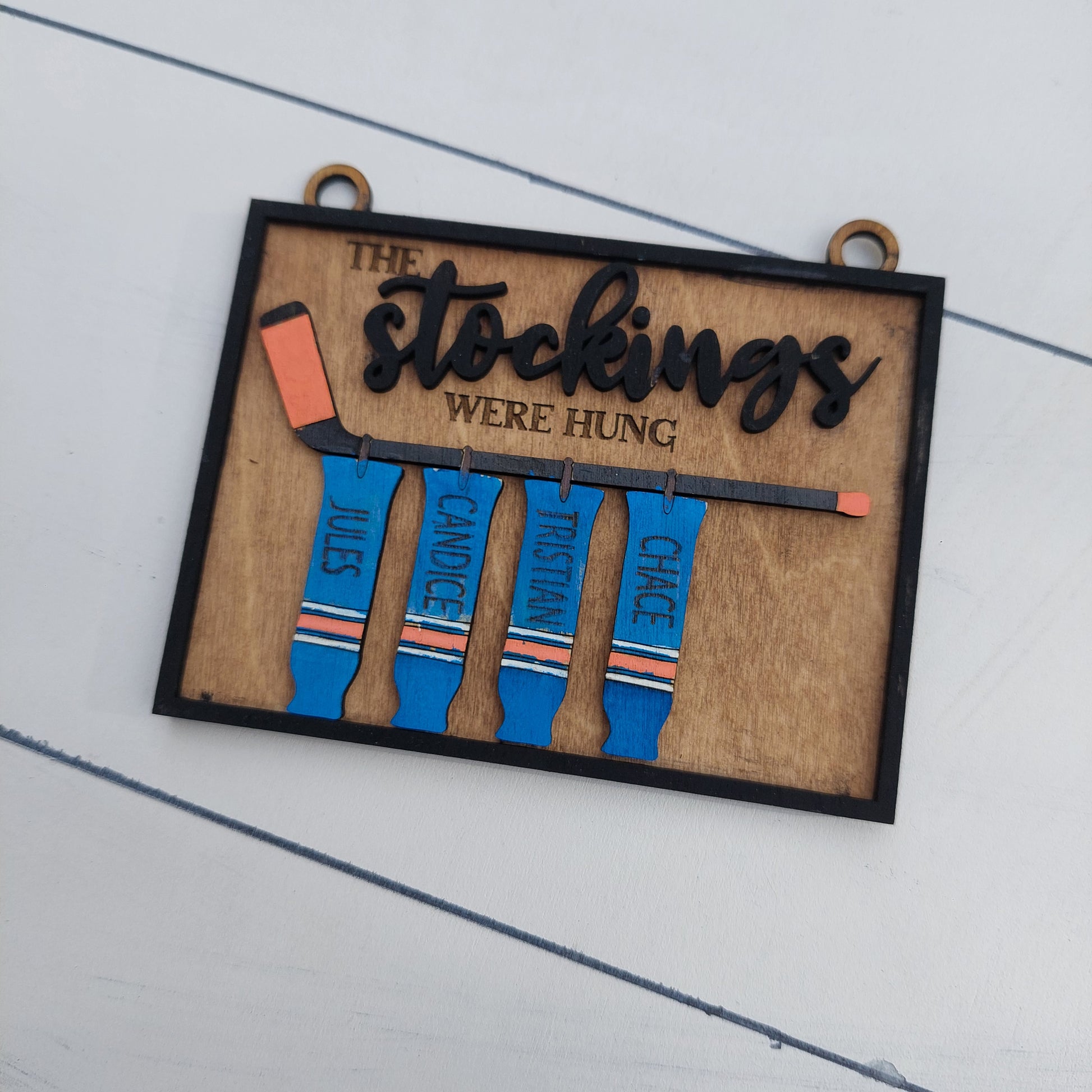 Personalized Hockey Socks Family Ornament. The names are engraved onto each of the socks.