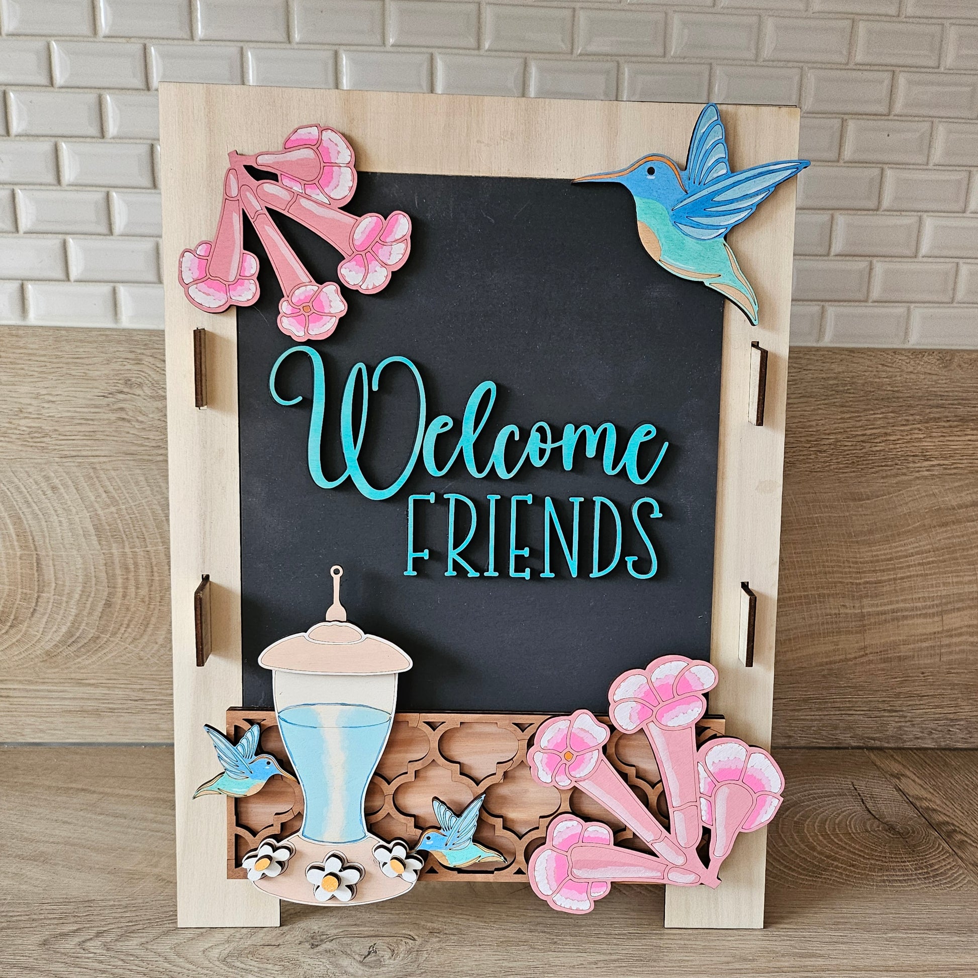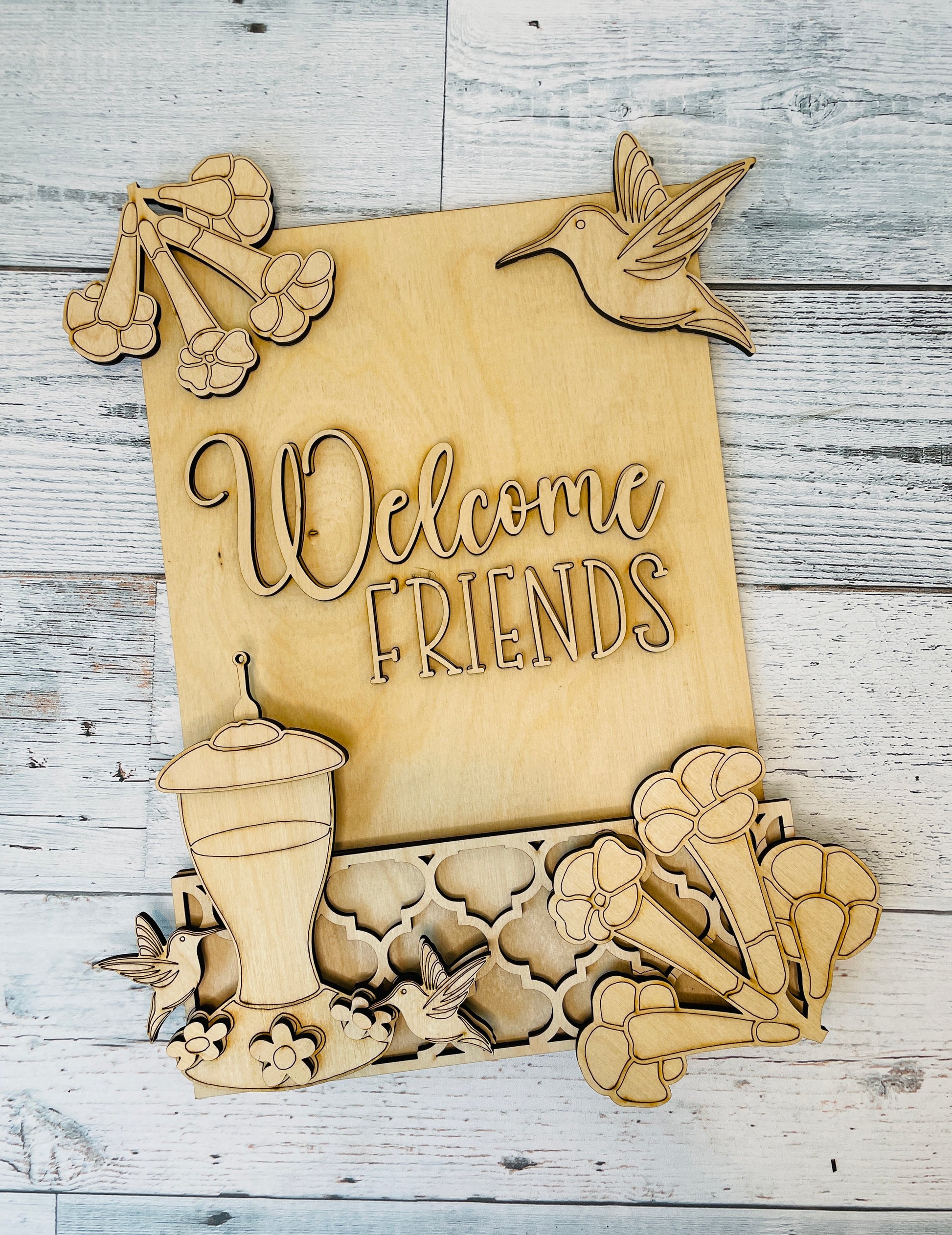 - Welcome friends, humming bird, feeder, flowers, and backing